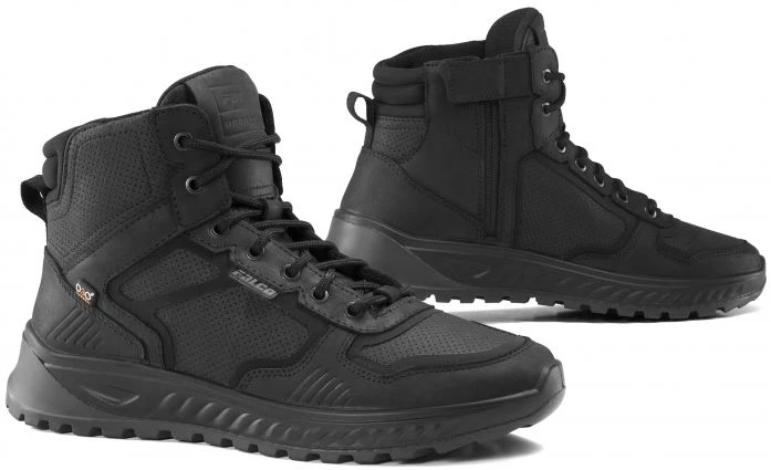 Perforated leather upper and “High-Tex” membrane. Reinforced toe, heel and “D3O” backed ankle inserts. Laces and zip quick closure. Raised- heel comfort insole. High grip dual-compound rubber sole.